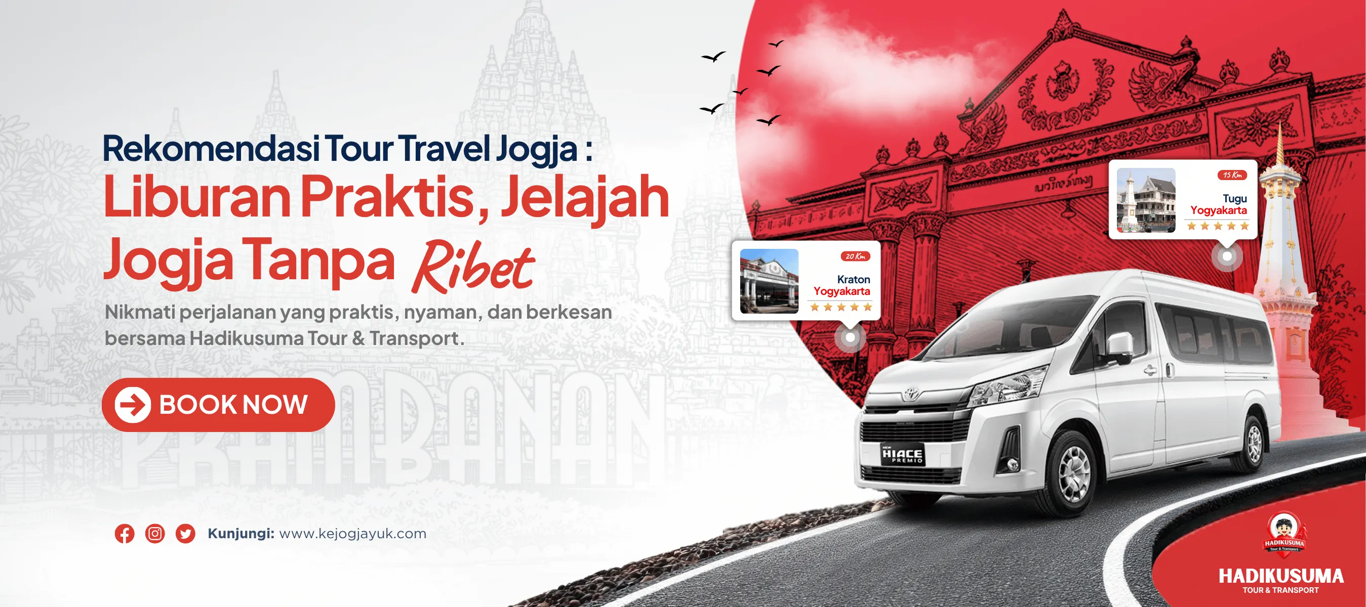 HADIKUSUMA TOUR & TRANSPORT menyediakan layanan transportasi dan paket wisata di Yogyakarta yang hadir untuk memberikan pengalaman perjalanan yang praktis, nyaman, dan berkesan. Kami melayani berbagai kebutuhan perjalanan, mulai dari wisata keluarga, trip rombongan, perjalanan bisnis, hingga layanan antar jemput di area Jogja dan sekitarnya.